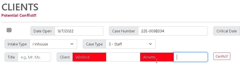 If the person's name (or a diminutive first name such as 'Dick' for 'Richard') appears as an Adverse Party in the Conflict table, the first and last name will be highlighted in red. A button will appear after the name showing "Conflict?". Clicking that button will bring up the Conflict Check screen.